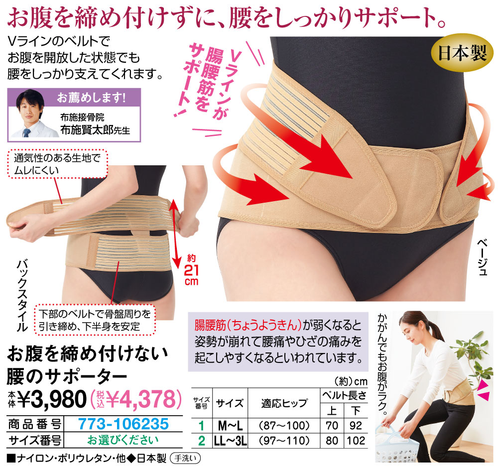 お腹を締め付けずに、腰をしっかりサポート! Vラインのベルトでお腹を開放した状態でも腰をしっかり支えてくれます。 Vラインが腸腰筋をサポート! 通気性のある生地でムレにくい 下部のベルトで骨盤周りを引き締め、下半身を安定 かがんでもお腹がラク。 腸腰筋(ちょうようきん)が弱くなると姿勢が崩れて腰痛やひざの痛みを起こしやすくなるといわれています。 【お薦めします!】 布施接骨院 布施賢太郎先生