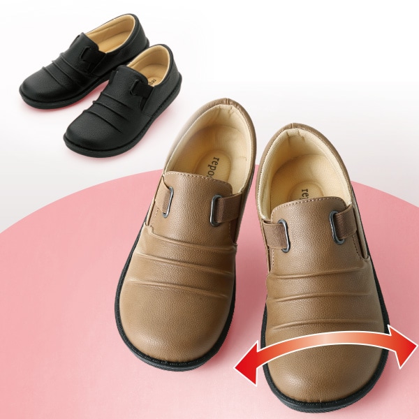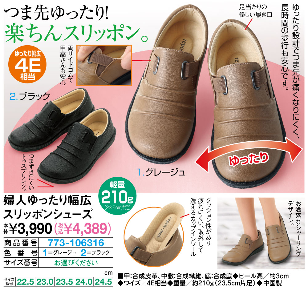 つま先ゆったり!楽ちんスリッポン! ゆったり設計でつま先が痛くなりにくく、長時間の歩行も安心です。 お洒落なシャーリングデザイン。 クッション性があり疲れにくい、取外して洗えるカップインソール 両サイドゴムで甲高さんも安心 つまずきにくいトゥスプリング。 足当たりの優しい履き口 ●ゆったり幅広4E相当 ●軽量210g(23.5cm片足)