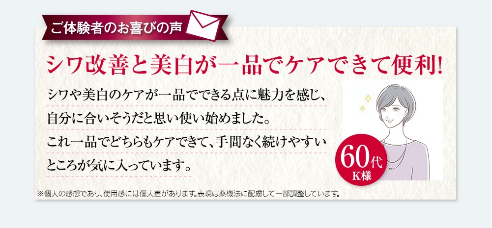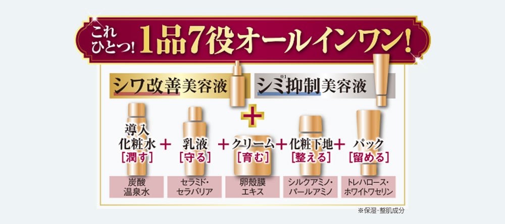 ◎「シワを改善」して「美白(※1)」もする。 ◎年齢肌の二大悩み、「シワ」と「シミ(※1)」を同時にケアする進化型オールインワンゲル。 ◎今あるシワを改善してシミ予防もする本格エイジングケア(※2)を毎日のお手入れで簡単に。 ※1メラニンの生成を抑え、シミ、ソバカスを防ぎます。 ※2年齢に応じた、ハリやうるおいのお手入れ。