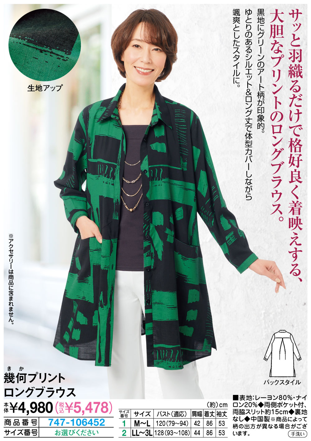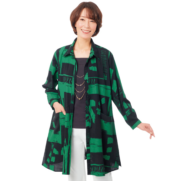 サッと羽織るだけで格好良く着映えする、大胆なプリントのロングブラウス!