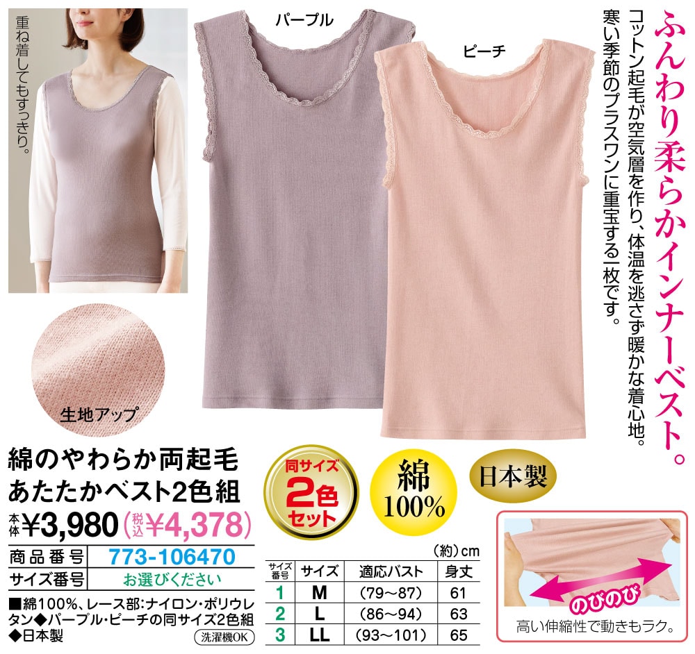 ふんわり柔らかインナーベスト! コットン起毛で優しい温もり。季節の変わり目の体温調節に便利な一枚です。 重ね着してもすっきり。 高い伸縮性で動きもラク。 ●同サイズ2色セット