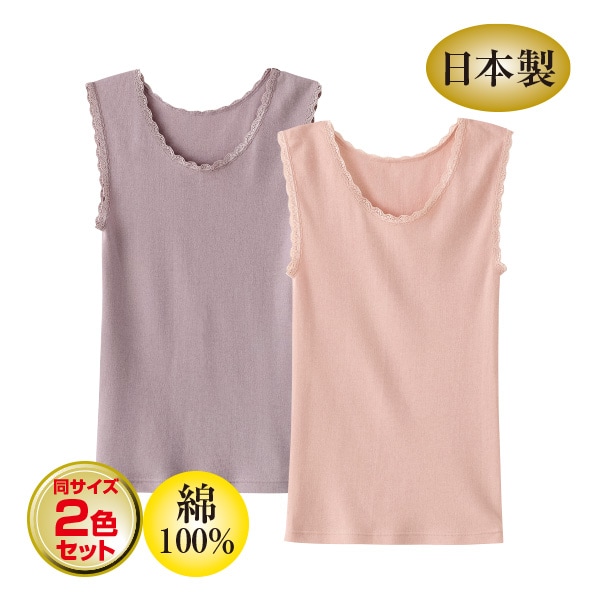 【サイズ(約)】 適応バスト、身丈 <M>(79~87)cm、61cm <L>(86~94)cm、63cm <LL>(93~101)cm、65cm ■綿100%、レース部:ナイロン・ポリウレタン ◆パープル・ピーチの同サイズ2色組 ◆日本製