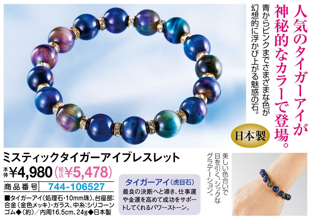 人気のタイガーアイが神秘的なカラーで登場! 青からピンクまでさまざまな色が幻想的に浮かび上がる魅惑の石。 【タイガーアイ(虎目石)】 最良の決断へと導き、仕事運や金運を高めて成功をサポートしてくれるパワーストーン。 美しい色合いで目を引く、シックなグラデーション。