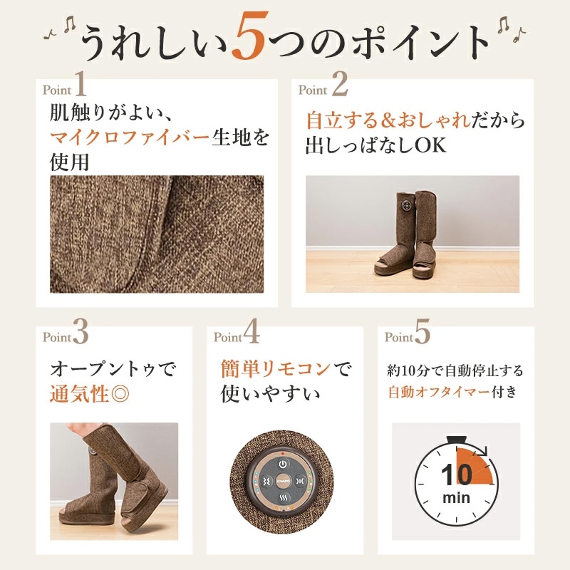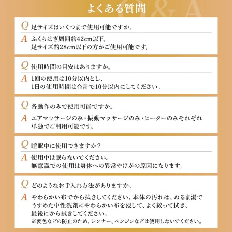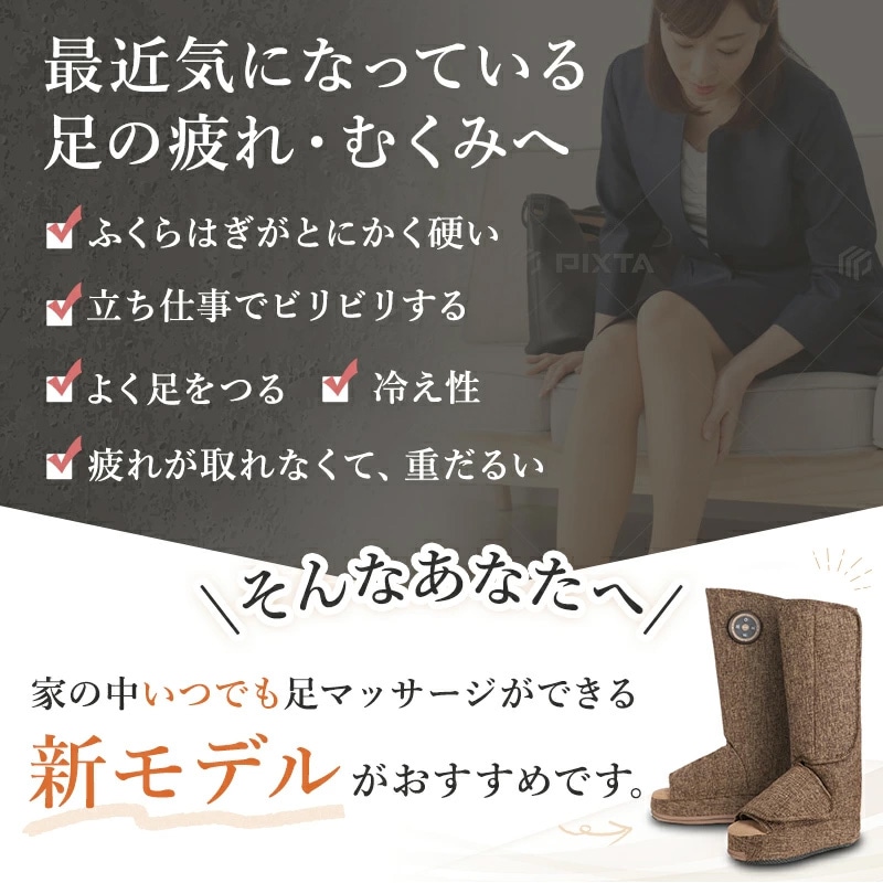 第二の心臓と呼ばれる「ふくらはぎ」の血行促進し、むくみを改善。 ヒーターが内蔵され人肌程度に温まり、まるで人の手のようなもみ心地を実現。 マッサージで心地よくほぐして血行改善、筋肉の緊張やコリほぐしてストレスを解消しましょう。 コードレス&歩ける!家中どこでも”ながら”マッサージ! ・洗い物などの家事をしながら ・ベットの上で自由な姿勢をとりながら ・デスクワークしながら 【医療機器認証番号:305AKBZX00039000】 【4つの効果】疲労回復・血行促進・筋肉のコリほぐし、疲れの回復・神経痛、筋肉痛の軽減