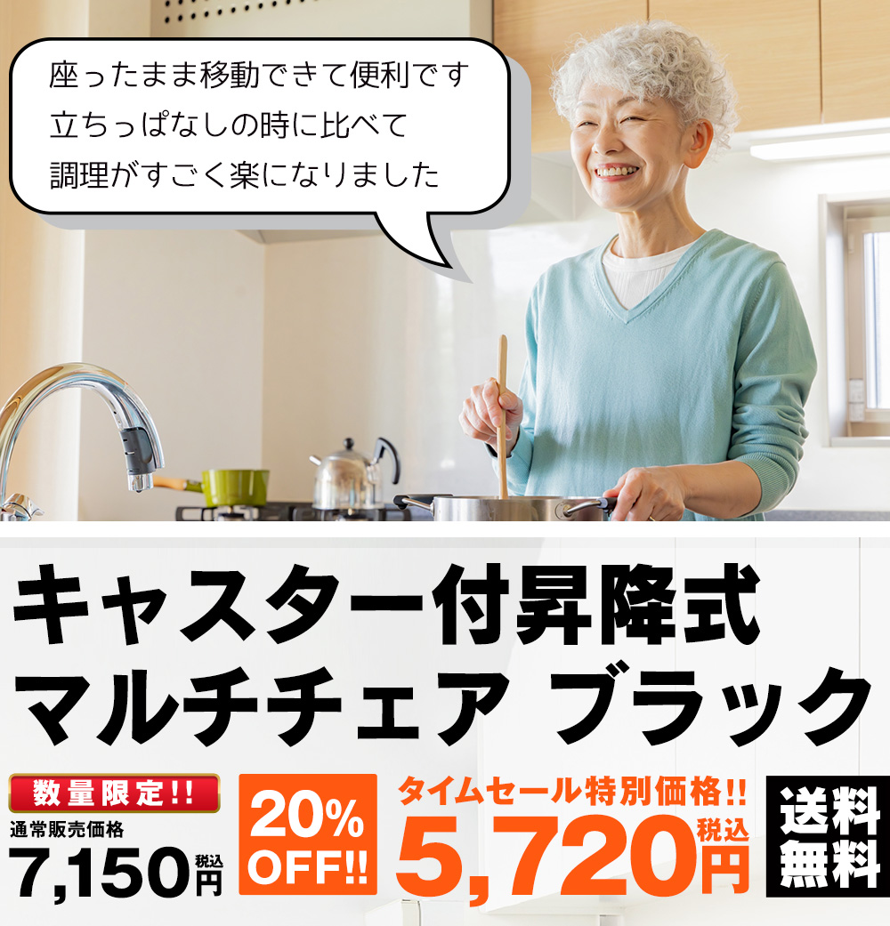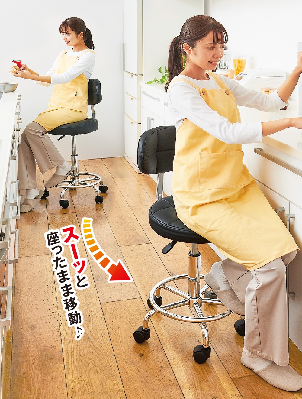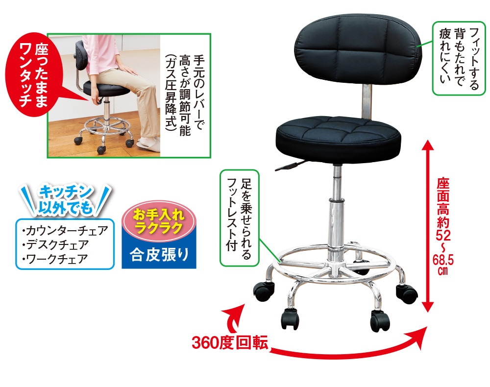 キッチンでの作業をサポート!便利に使えるバックレストマルチチェア! 背もたれが腰にフィットして疲れにくいのでラク! 足を乗せられるフットレスト付 背もたれ(バックレスト)付 来客時の補助チェアとしても \キッチン以外でも/ ・カウンターチェア ・デスクチェア ・ワークチェア 360度回転 キャスター付 座面高約52~68.5cm 座面を高めに調節すれば立った状態に近い姿勢で作業がラク♪ 【座ったままワンタッチ】 手元のレバーで高さが調節可能(ガス圧昇降式) ●お手入れラクラク合皮張り
