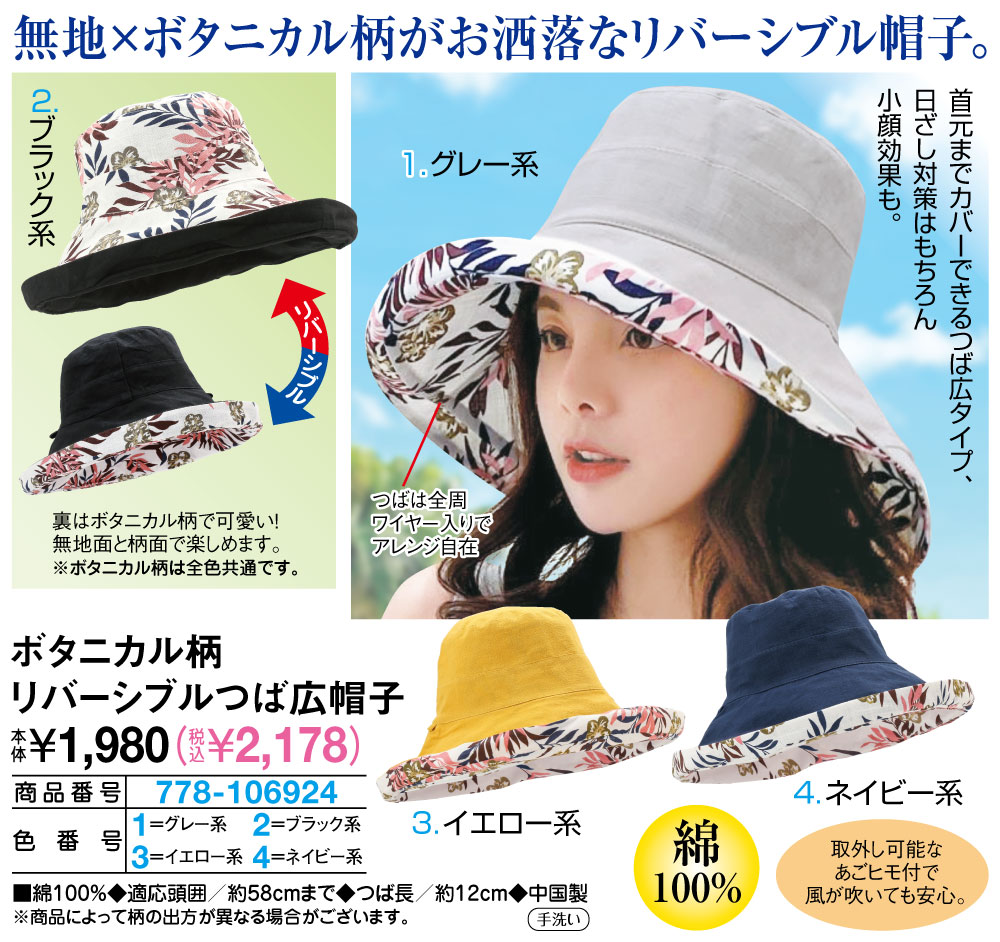 ボタニカル柄リバーシブルつば広帽子