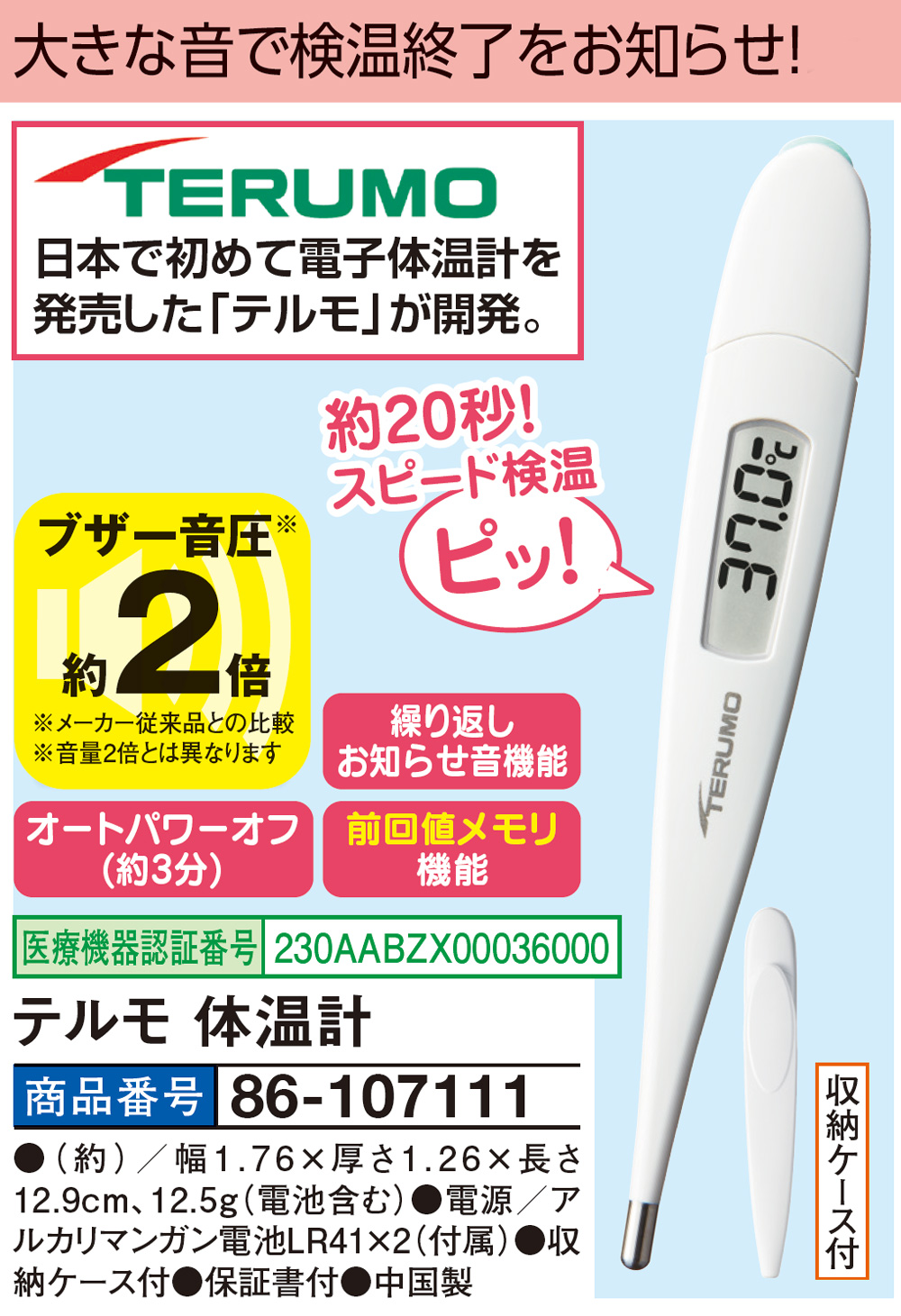 大きな音で検温終了をお知らせ! TERUMO 日本で初めて電子体温計を発売した「テルモ」が開発。 約20秒!スピード検温 ブザー音圧 ※約2倍(メーカー従来品との比較) ※音量2倍とは異なります。 ●繰り返しお知らせ音機能 ●オートパワーオフ(約3分) ●前回値メモリ機能 ●収納ケース付 ◆医療機器認証番号:230AABZX00036000