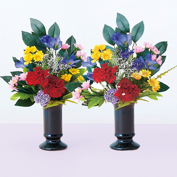 美しさ続く、お手入れ不要の仏花! ご先祖様の仏壇はいつも綺麗に 水やりも交換も不要で経済的! プリザーブドフラワー(カーネーション、かすみ草)+造花 ●花器付 空気をクリーンに保つCT触媒 ●浄化・消臭 ●防汚・抗菌