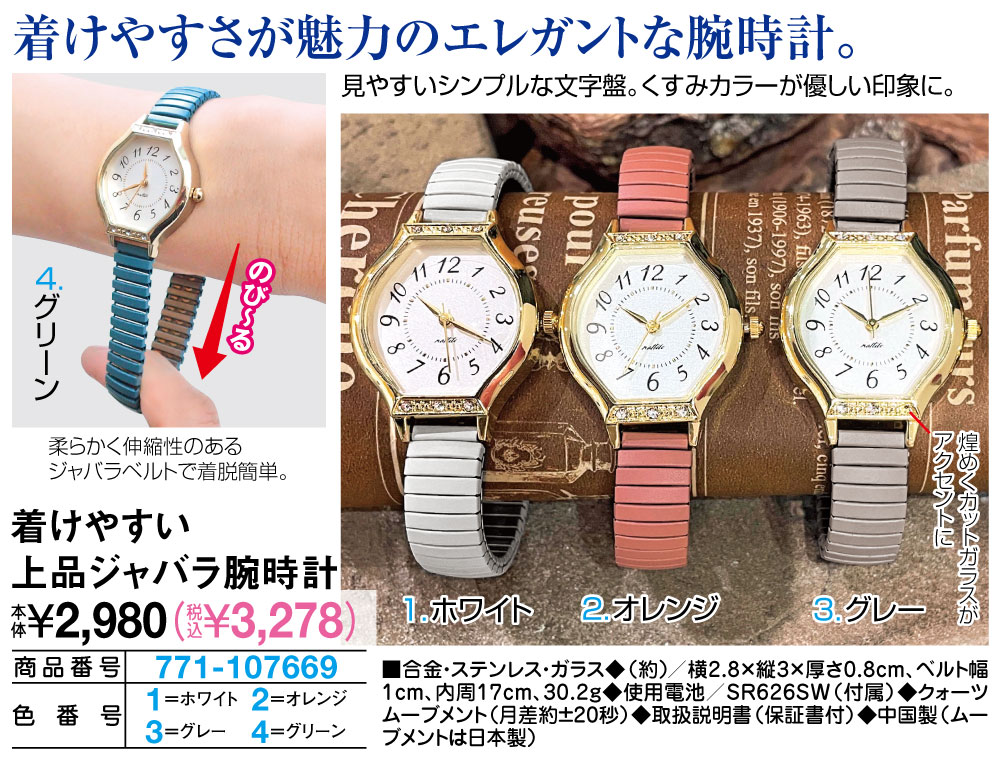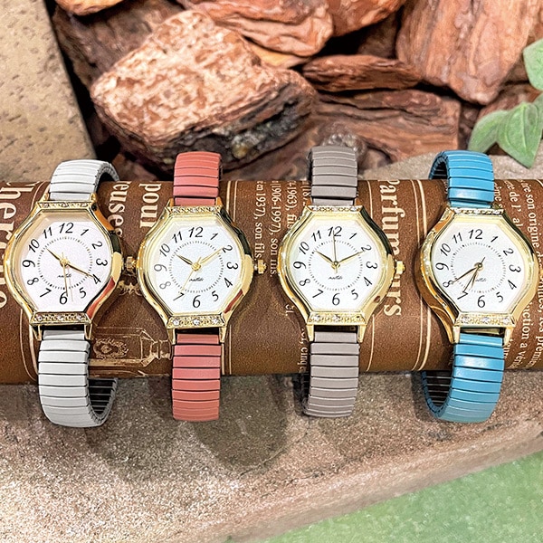 着けやすさが魅力のエレガントな腕時計! 見やすいシンプルな文字盤。くすみカラーが優しい印象に。 柔らかく伸縮性のあるジャバラベルトで着脱簡単。 煌めくカットガラスがアクセントに