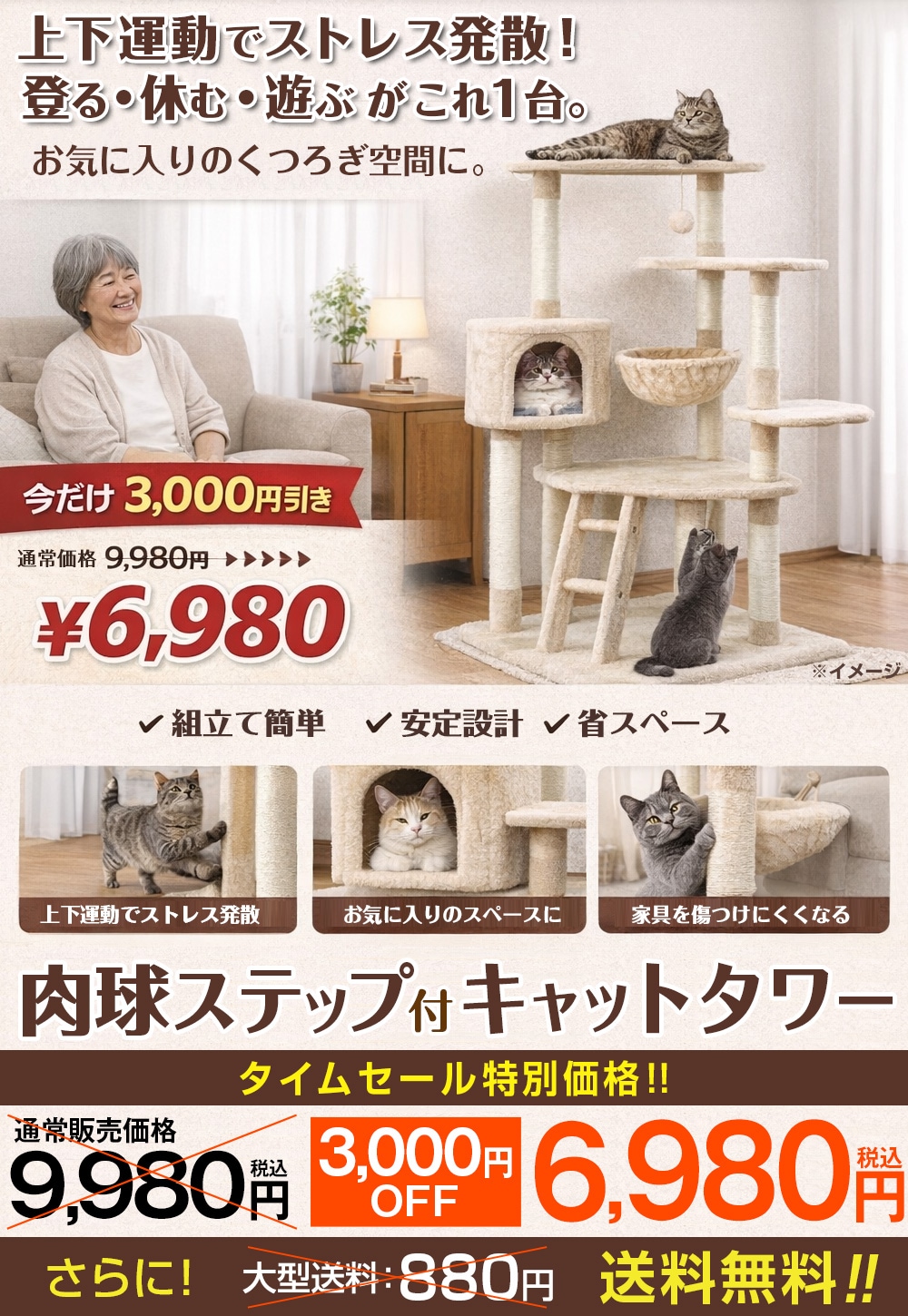 ネコちゃんの運動不足やストレス発散に! 室内にちょうど良い省スペースの据え置きタイプ 表面は起毛張りでふんわり♪ お昼寝にぴったりハンモック付! 楽しく遊んでお昼寝できてネコちゃん快適! 肉球をイメージしたかわいいステップ 肉球ステップとハンモックはスペースに合わせて回転可 支柱が3本あって安定性も◎ 支柱(ポール)には麻ヒモを巻いているので爪とぎOK! 穴好きのネコちゃんが喜ぶ♪ ネコちゃん専用隠れ家 ●爪とぎに ●屋内専用