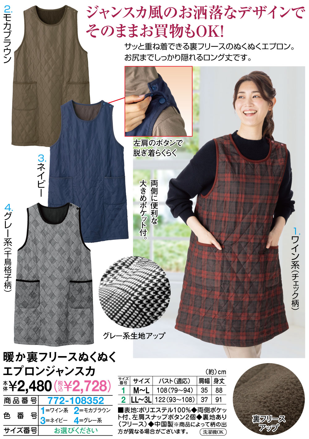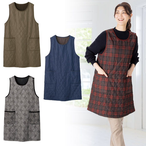 サッと重ね着できる裏フリースのぬくぬくエプロン。お尻までしっかり隠れるロング丈です。