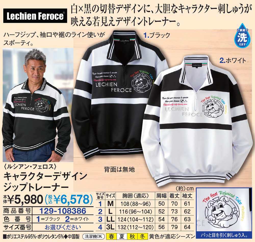 白×黒の切替デザインに、大胆なキャラクター刺しゅうが映える若見えデザイントレーナー!