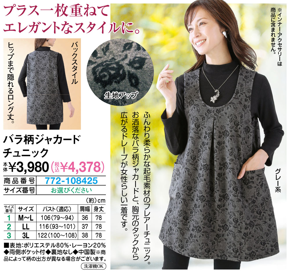 プラス一枚重ねてエレガントなスタイルに! ふんわり柔らかな起毛素材のフレアーチュニック。 お洒落なバラ柄ジャカードと、胸元のタックから広がるドレープが女性らしい一着です。 ヒップまで隠れるロング丈。