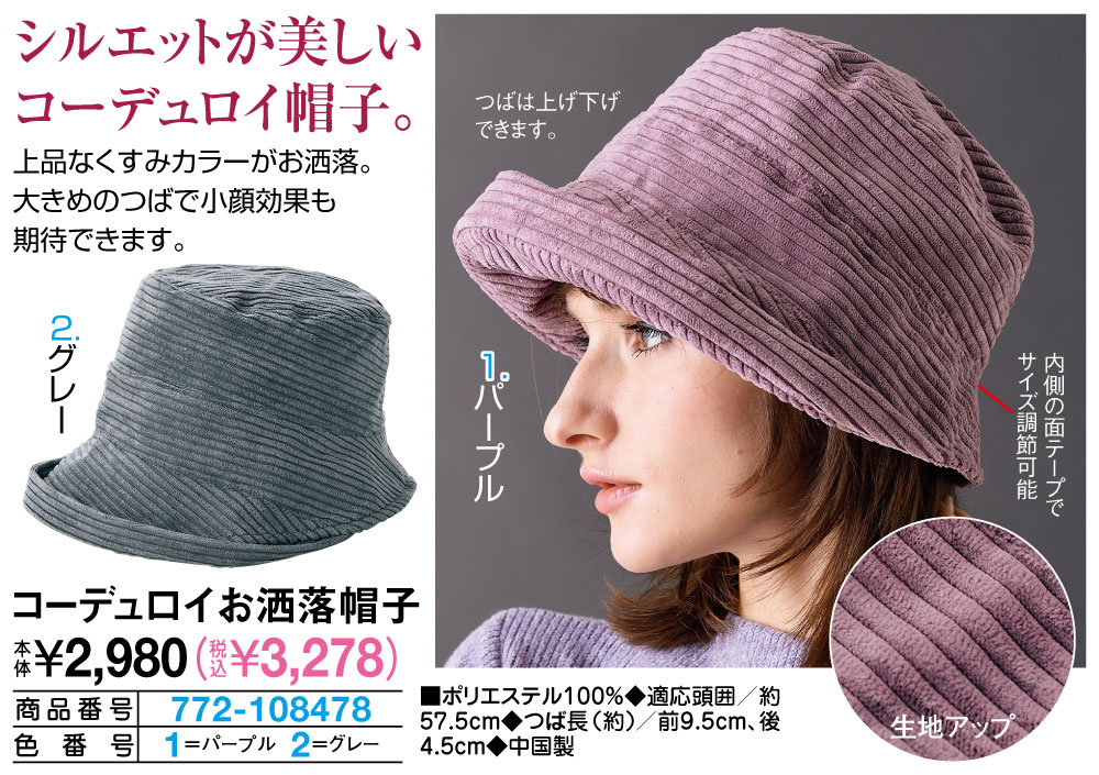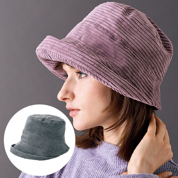 シルエットが美しいコーデュロイ帽子! 上品なくすみカラーがお洒落。大きめのつばで小顔効果も期待できます。 つばは上げ下げできます。 内側の面テープでサイズ調節可能