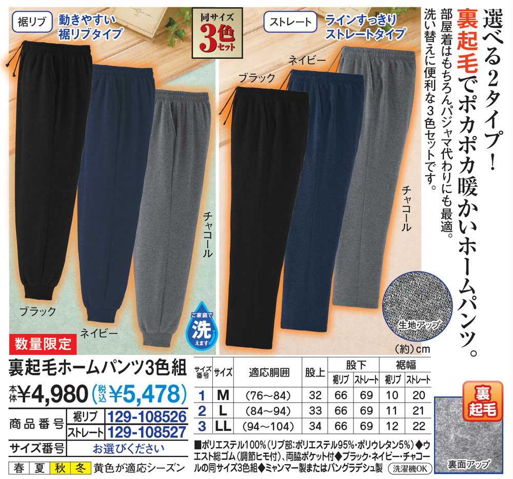 選べる2タイプ!裏起毛でポカポカ暖かいホームパンツ! 部屋着はもちろんパジャマ代わりにも最適。 洗い替えに便利な3色セットです。 【裾リブ】動きやすい裾リブタイプ 【ストレート】ラインすっきりストレートタイプ ●裏起毛 ●同サイズ3色セット