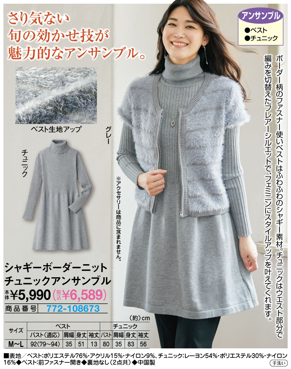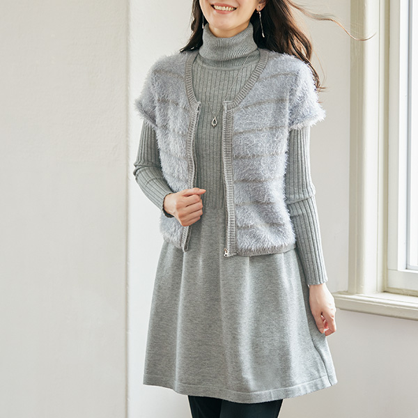さり気ない旬の効かせ技が魅力的なアンサンブル! ボーダー柄のファスナー使いベストはふわふわのシャギー素材。 チュニックはウエスト部分で編みを切替えたフレアーシルエットで、フェミニンにスタイルアップを叶えてくれます。 【アンサンブル】 ●ベスト ●チュニック