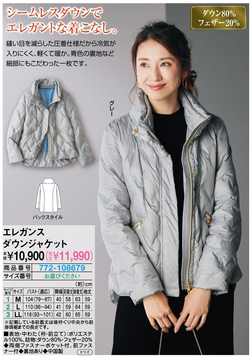 【サイズ(約)】 バスト(適応)、肩幅、前着丈、後着丈、袖丈 <M>104(79~87)cm、40cm、58cm、63cm、59cm <L>110(86~94)cm、41cm、59cm、64cm、59cm <LL>116(93~101)cm、42cm、60cm、65cm、59cm ■表地・中わた(衿・前立て):ポリエステル100%、詰物:ダウン80%・フェザー20% ◆両側ファスナーポケット付、前ファスナー付 ◆裏地あり ◆中国製