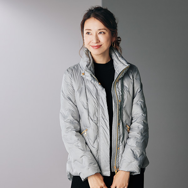 シームレスダウンでエレガントな着こなし! 縫い目を減らした圧着仕様だから冷気が入りにくく、軽くて暖か。 青色の裏地など細部にもこだわった一枚です。 ●ダウン80%・フェザー20%