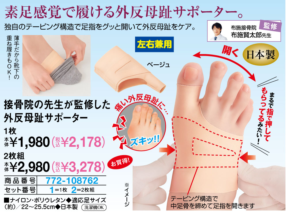 独自のテーピング構造で足指をグッと開いて外反母趾をケア。
