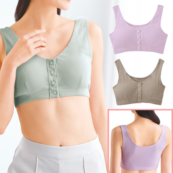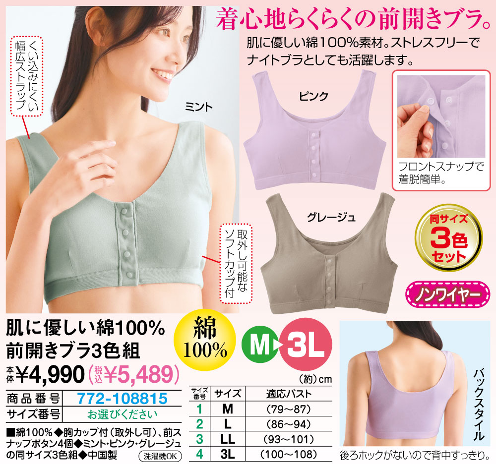 着心地らくらくの前開きブラ! 肌に優しい綿100%素材。 ストレスフリーでナイトブラとしても活躍します。 くい込みにくい幅広ストラップ 取外し可能なソフトカップ付 フロントスナップで着脱簡単。 後ろホックがないので背中すっきり。 ●ノンワイヤー ●同サイズ3色セット ●M~3L ●綿100%