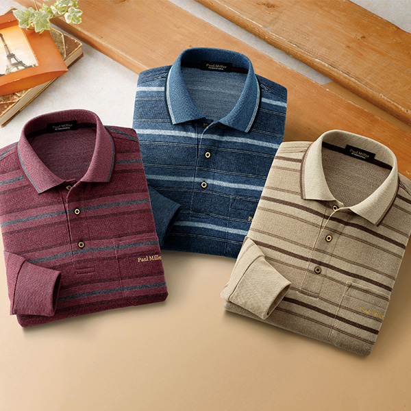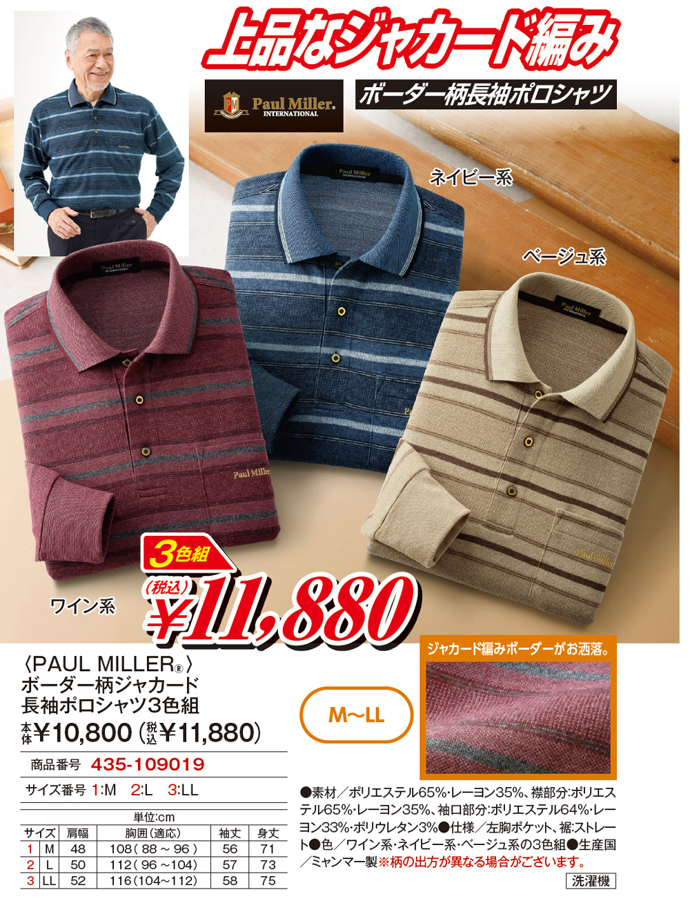 ●素材/ポリエステル65%・レーヨン35%、襟部分:ポリエステル65%・レーヨン35%、袖口部分:ポリエステル64%・レーヨン33%・ポリウレタン3% ●仕様/左胸ポケット、裾:ストレート ●色/ワイン系・ネイビー系・ベージュ系の3色組 ●生産国/ミャンマー製