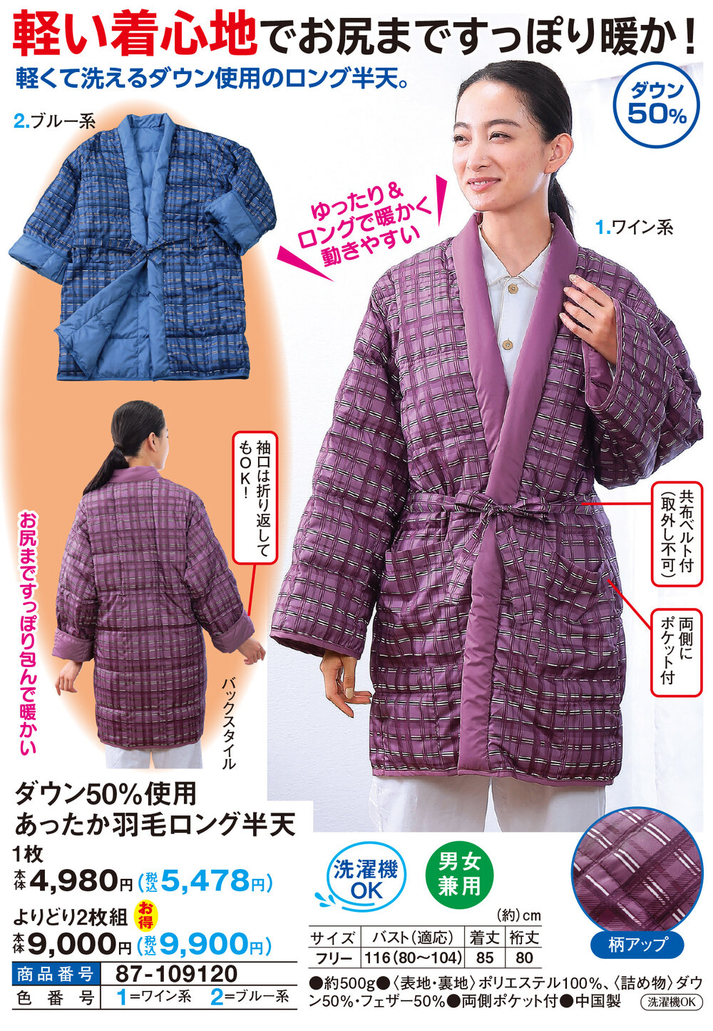 ダウン50%使用あったか羽毛ロング半天