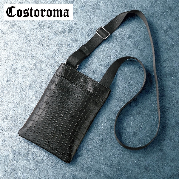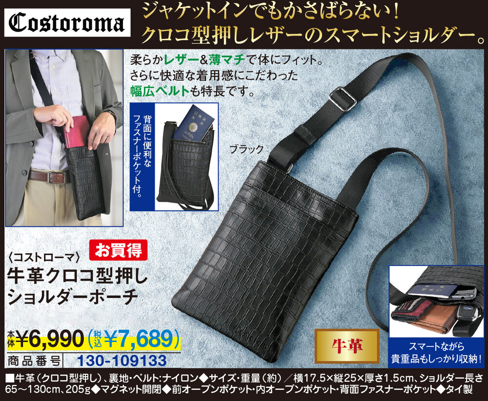 ジャケットインでもかさばらない!クロコ型押しレザーのスマートショルダー! 柔らかレザー&薄マチで体にフィット。 さらに快適な着用感にこだわった幅広ベルトも特長です。 スマートながら貴重品もしっかり収納! 背面に便利なファスナーポケット付。 ●牛革