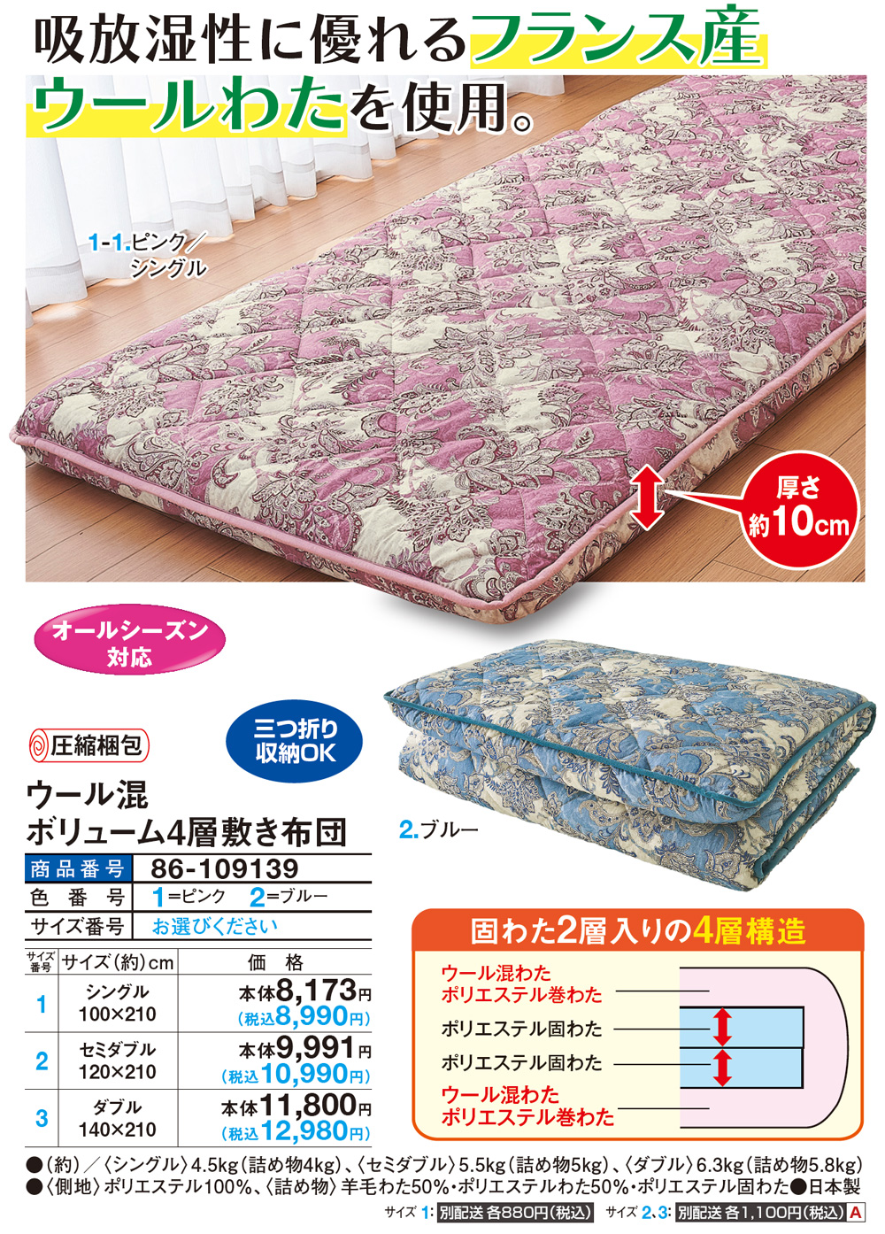 吸放湿性に優れるフランス産ウールわたを使用! こだわりの日本製敷き布団 厚さ約10cm ●固わた2層入りの4層構造 ●オールシーズン対応 ●三つ折り収納OK ●圧縮梱包