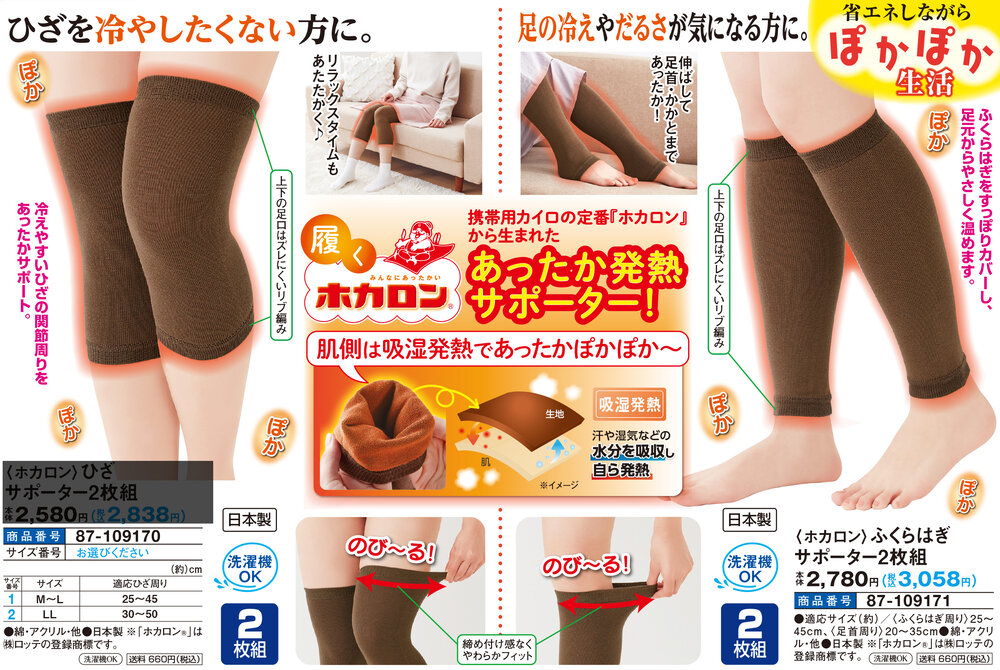 足の冷えやだるさが気になる方に! 省エネしながらぽかぽか生活。 【履くホカロン(R)】 携帯用カイロの定番『ホカロン』から生まれた、あったか発熱サポーター! 肌側は吸湿発熱であったかぽかぽか~。 <吸湿発熱>汗や湿気などの水分を吸収し自ら発熱。 ふくらはぎをすっぽりカバーし、足元からやさしく温めます。 伸ばして足首・かかとまであったか! 上下の足口はズレにくいリブ編み。 締め付け感なくやわらかフィット。