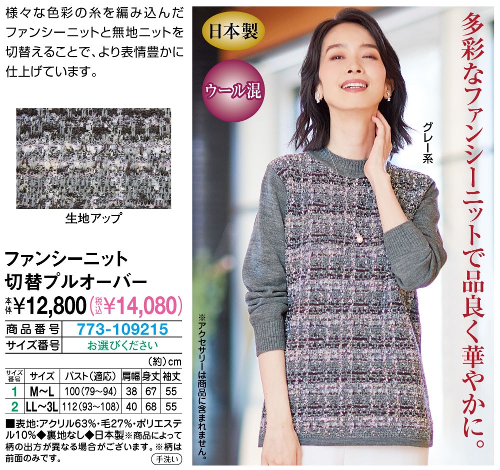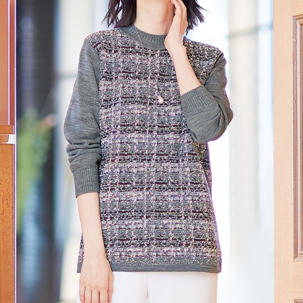 多彩なファンシーニットで品良く華やかに! 様々な色彩の糸を編み込んだファンシーニットと 無地ニットを切替えることで、より表情豊かに仕上げています。 ●ウール混
