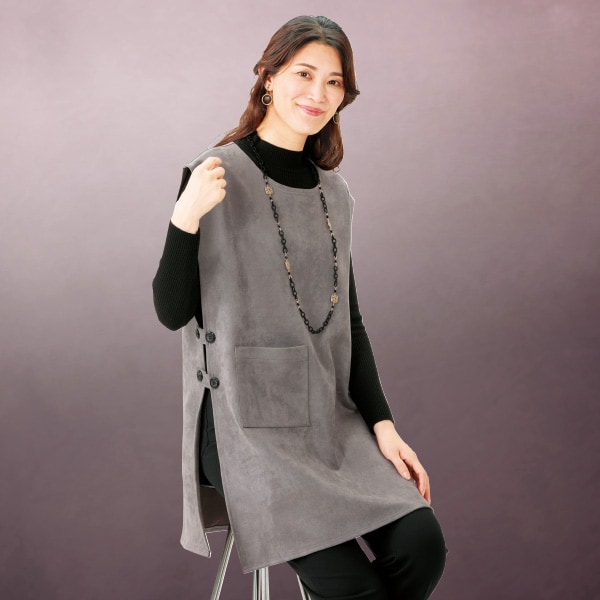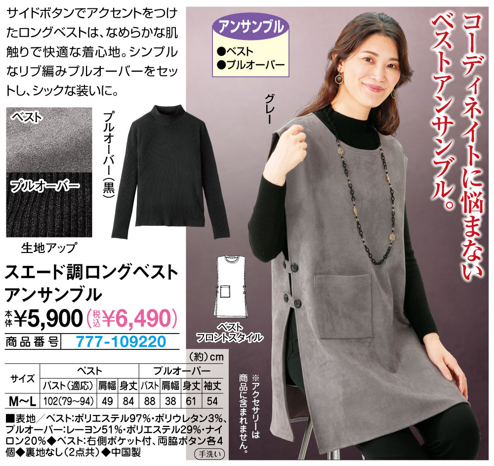 コーディネイトに悩まないベストアンサンブル! サイドボタンでアクセントをつけたロングベストは、なめらかな肌触りで快適な着心地。 シンプルなリブ編みプルオーバーをセットし、シックな装いに。 【アンサンブル】 ・ベスト ・プルオーバー