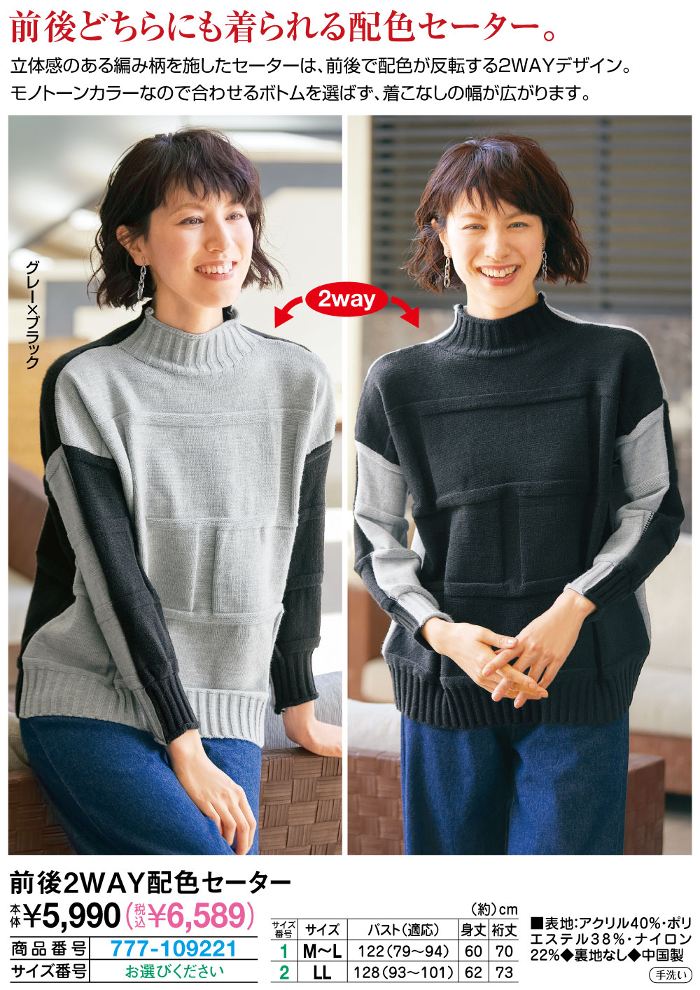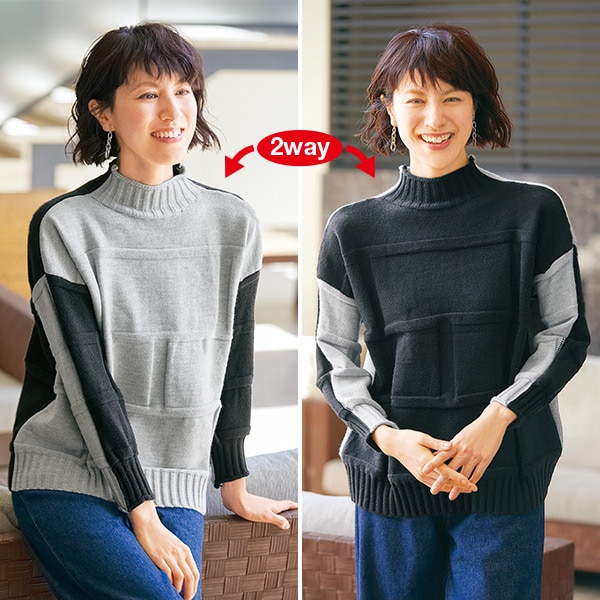前後どちらにも着られる配色セーター! 立体感のある編み柄を施したセーターは、前後で配色が反転する2WAYデザイン。 モノトーンカラーなので合わせるボトムを選ばず、着こなしの幅が広がります。 ●2way