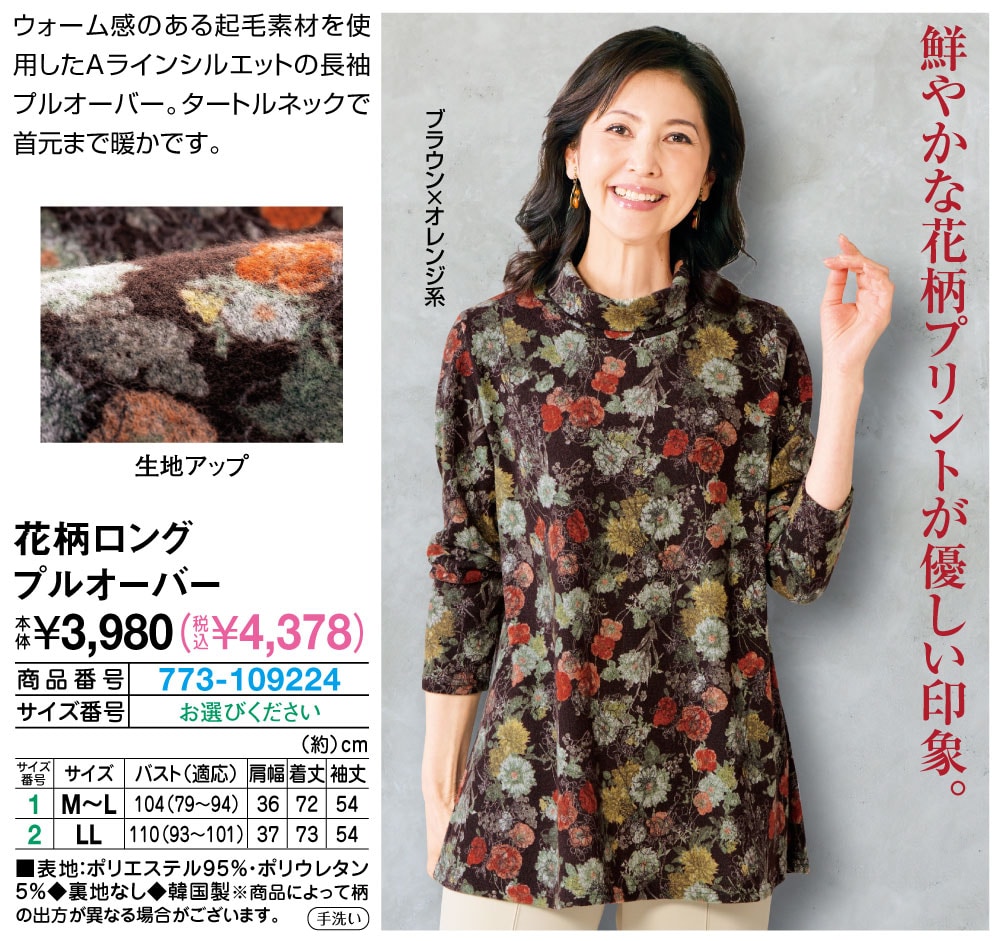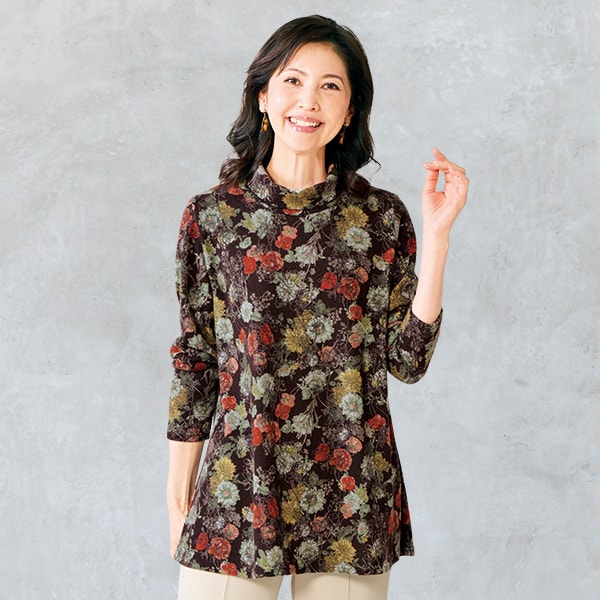 鮮やかな花柄プリントが優しい印象! ウォーム感のある起毛素材を使用した Aラインシルエットの長袖プルオーバー。 タートルネックで首元まで暖かです。
