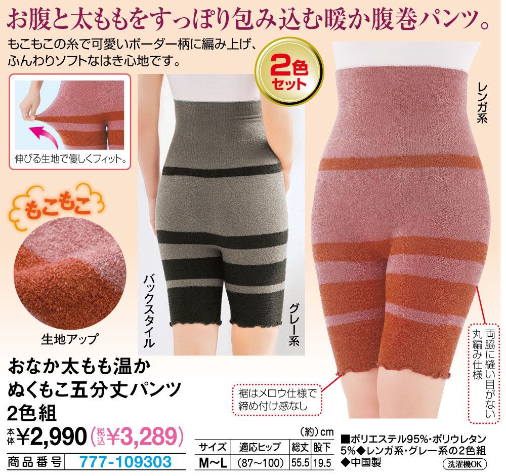 お腹と太ももをすっぽり包み込む暖か腹巻パンツ! もこもこの糸で可愛いボーダー柄に編み上げ、ふんわりソフトなはき心地です。 両脇に縫い目がない丸編み仕様 裾はメロウ仕様で締め付け感なし 伸びる生地で優しくフィット。 ●2色セット