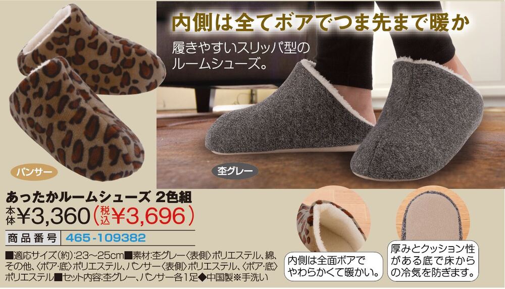 ●適応サイズ(約):23~25cm ●素材:杢グレー<表側>ポリエステル、綿、その他、<ボア・底>ポリエステル、パンサー<表側>ポリエステル、<ボア・底>ポリエステル ●セット内容:杢グレー、パンサー各1足 ◆中国製