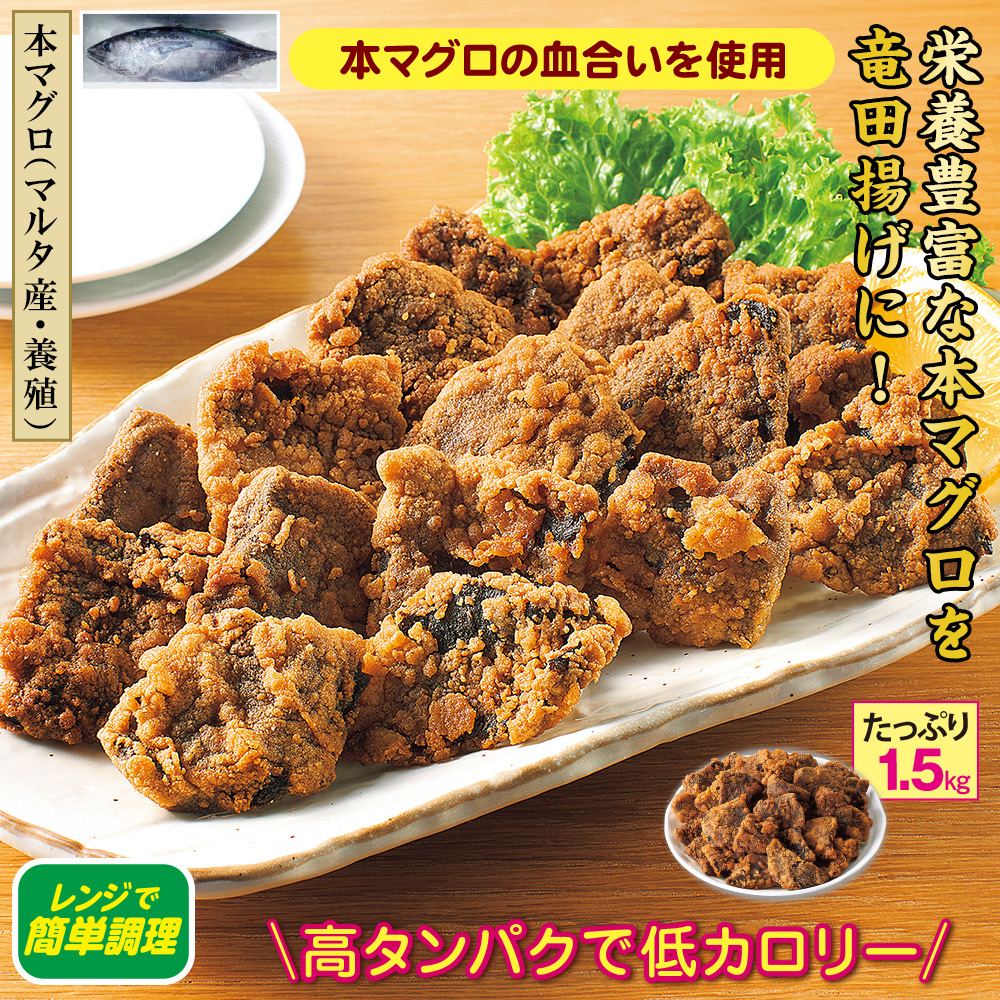 【本マグロ(マルタ産・養殖)】 本マグロの血合いを使用。 新鮮な本マグロの血合いを丁寧に下処理して、生姜と醤油のタレに漬け込み、衣をつけ揚げました。 高タンパクで低カロリー。 レンジで簡単調理!