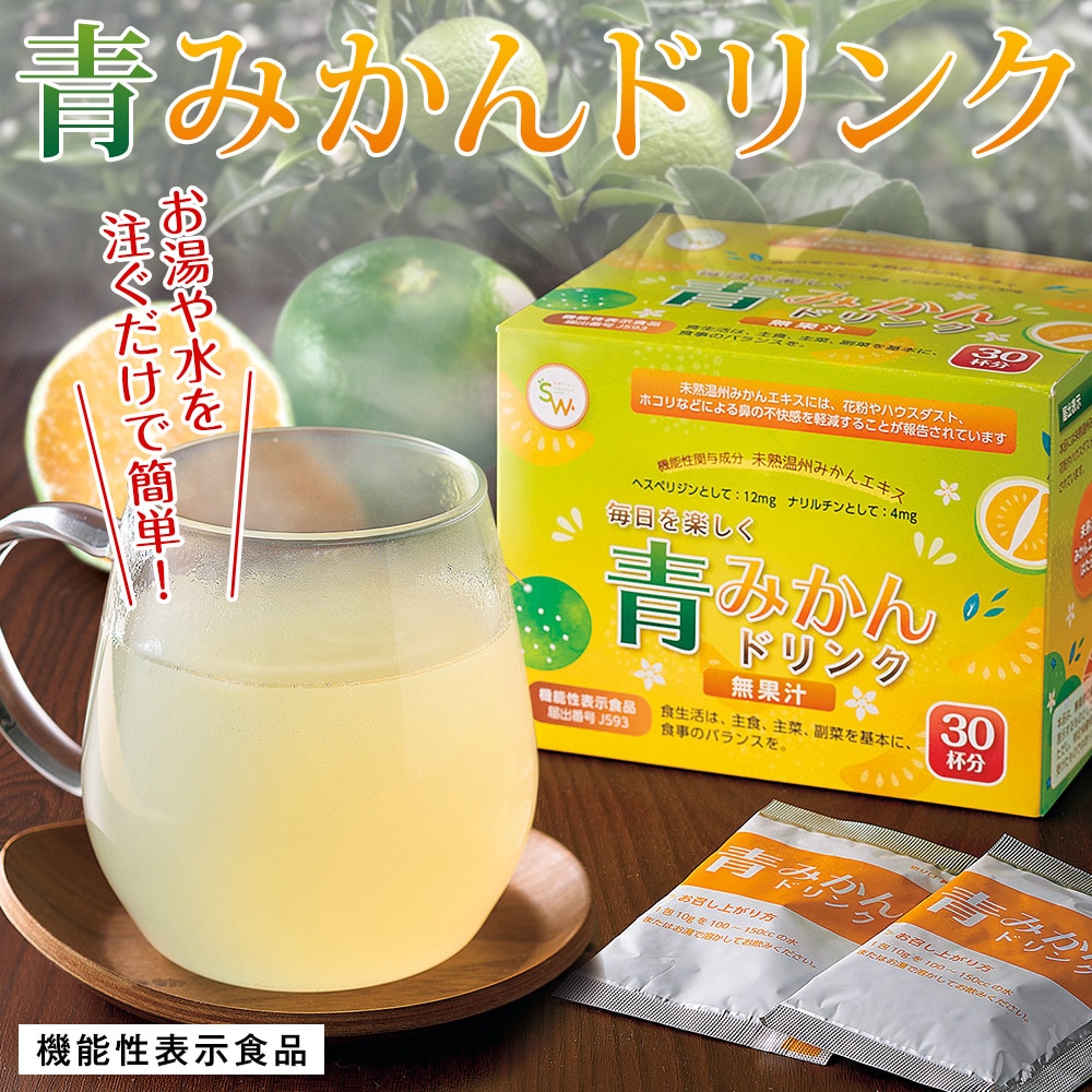 1年のうちポリフェノール量の多い時期を狙って収穫した青みかんを使用しています。 青みかんはそのままでは苦いので、国産ゆず果汁をブレンドし甘酸っぱく仕上げました。ホットでもアイスでも美味しくお召し上がり頂けます。 手軽に続けやすい個袋で使い切りタイプです。 ●未熟温州みかんエキスの働き:鼻の不快感を軽減(花粉やハウスダスト、ホコリなどによる鼻の不快感の軽減) 1日1袋、水やお湯に溶かして飲む。静岡県産の青みかんを使った、すっきり美味しいドリンク。消費者庁へ届出済の機能性表示食品です。 ●届出表示 本品には未熟温州みかんエキスが含まれます。未熟温州みかんエキスには、花粉やハウスダスト、ホコリなどによる鼻の不快感を軽減することが報告されています。 ●届出番号:J593 ●本品は、事業者の責任において特定の保健の目的が期待できる旨を表示するものとして、消費者庁長官に届出されたものです。ただし、特定保健用食品と異なり、消費者庁長官による個別審査を受けたものではありません。 ●食生活は、主食、主菜、副菜を基本に、食事のバランスを。