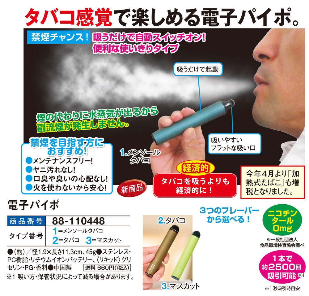 タバコ感覚で楽しめる電子パイポ! 【禁煙チャンス!】 吸うだけで自動スイッチオン!便利な使いきりタイプ 煙の代わりに水蒸気が出るから副流煙が発生しません。 \禁煙を目指す方におすすめ!/ ●メンテナンスフリー! ●ヤニ汚れなし! ●口臭や臭いの心配なし! ●火を使わないから安心! \経済的/ タバコ12.5箱分 約5500円もお得に! ※メーカー調べ 吸うだけで起動 吸いやすいフラットな吸い口 今年4月より「加熱式たばこ」も増税となりました。 ニコチンタール0mg ※一般社団法人食品環境検査協会調べ 1本で約2500回吸引可能(※1) ※1秒吸引時目安 計約7500回吸引(※1)
