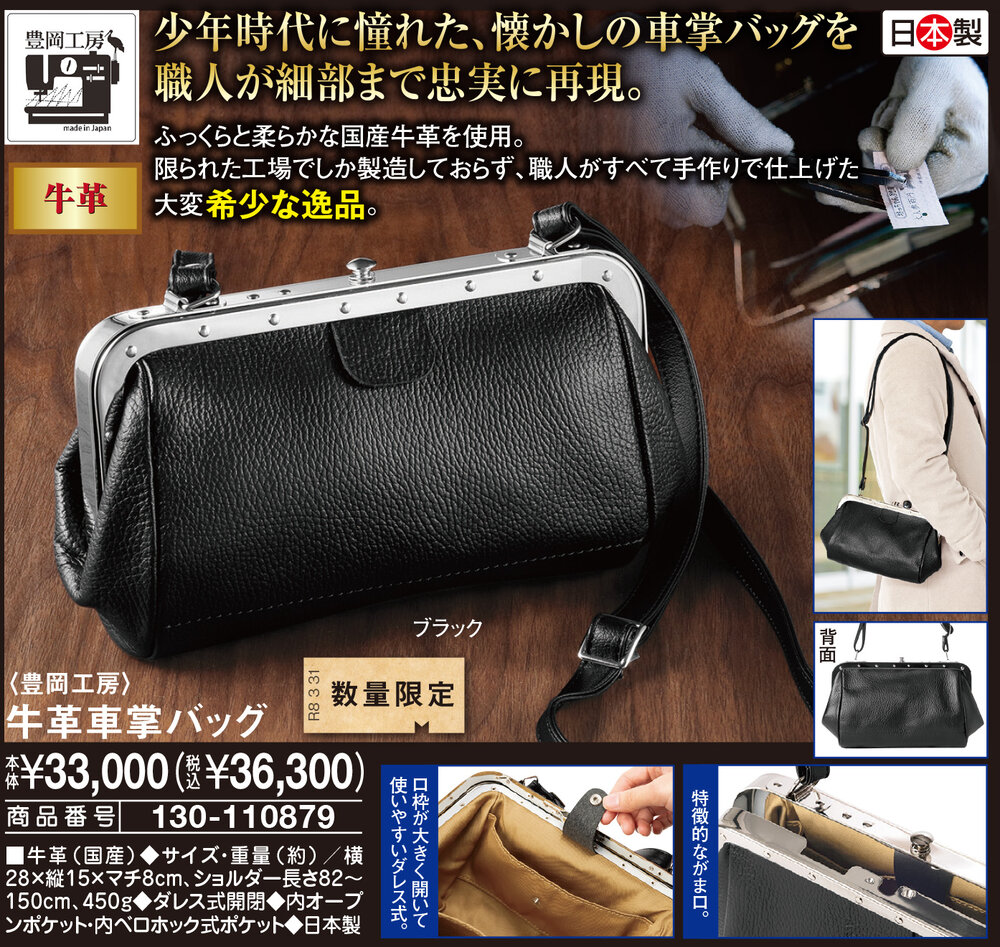 少年時代に憧れた、懐かしの車掌バッグを職人が細部まで忠実に再現! ふっくらと柔らかな国産牛革を使用。 限られた工場でしか製造しておらず、職人がすべて手作りで仕上げた大変希少な逸品。 口枠が大きく開いて使いやすいダレス式。 特徴的ながま口。 ●牛革