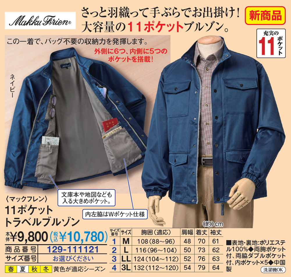 【サイズ(約)】 胸囲(適応)、肩幅、着丈、袖丈 <M>108(88~96)cm、48cm、70cm、61cm <L>116(96~104)cm、50cm、73cm、62cm <LL>124(104~112)cm、52cm、76cm、63cm <3L>132(112~120)cm、54cm、79cm、64cm ■表地・裏地:ポリエステル100% ◆両胸ポケット付、両脇ダブルポケット付、内ポケット×5 ◆中国製