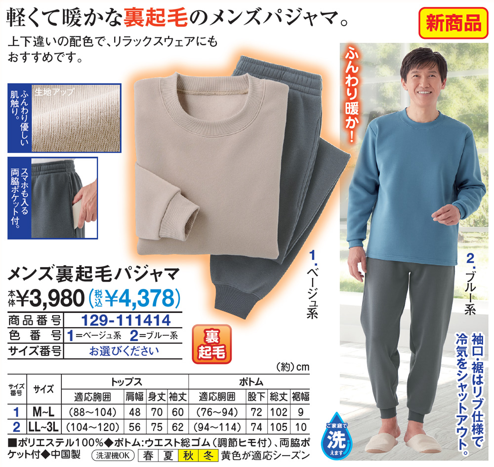 軽くて暖かな裏起毛のメンズパジャマ! 上下違いの配色で、リラックスウェアにもおすすめです。 ふんわり暖か! 袖口・裾はリブ仕様で冷気をシャットアウト。 ●ふんわり優しい肌触り。 ●スマホも入る両脇ポケット付。 ●裏起毛