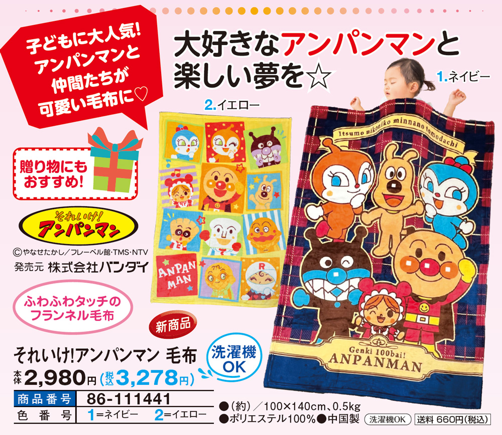 大好きなアンパンマンと楽しい夢を! 子どもに大人気! アンパンマンと仲間たちが可愛い毛布に ●ふわふわタッチのフランネル毛布 ●贈り物にもおすすめ! (C)やなせたかし/フレーベル館・TMS/NTV 発売元 株式会社バンダイ