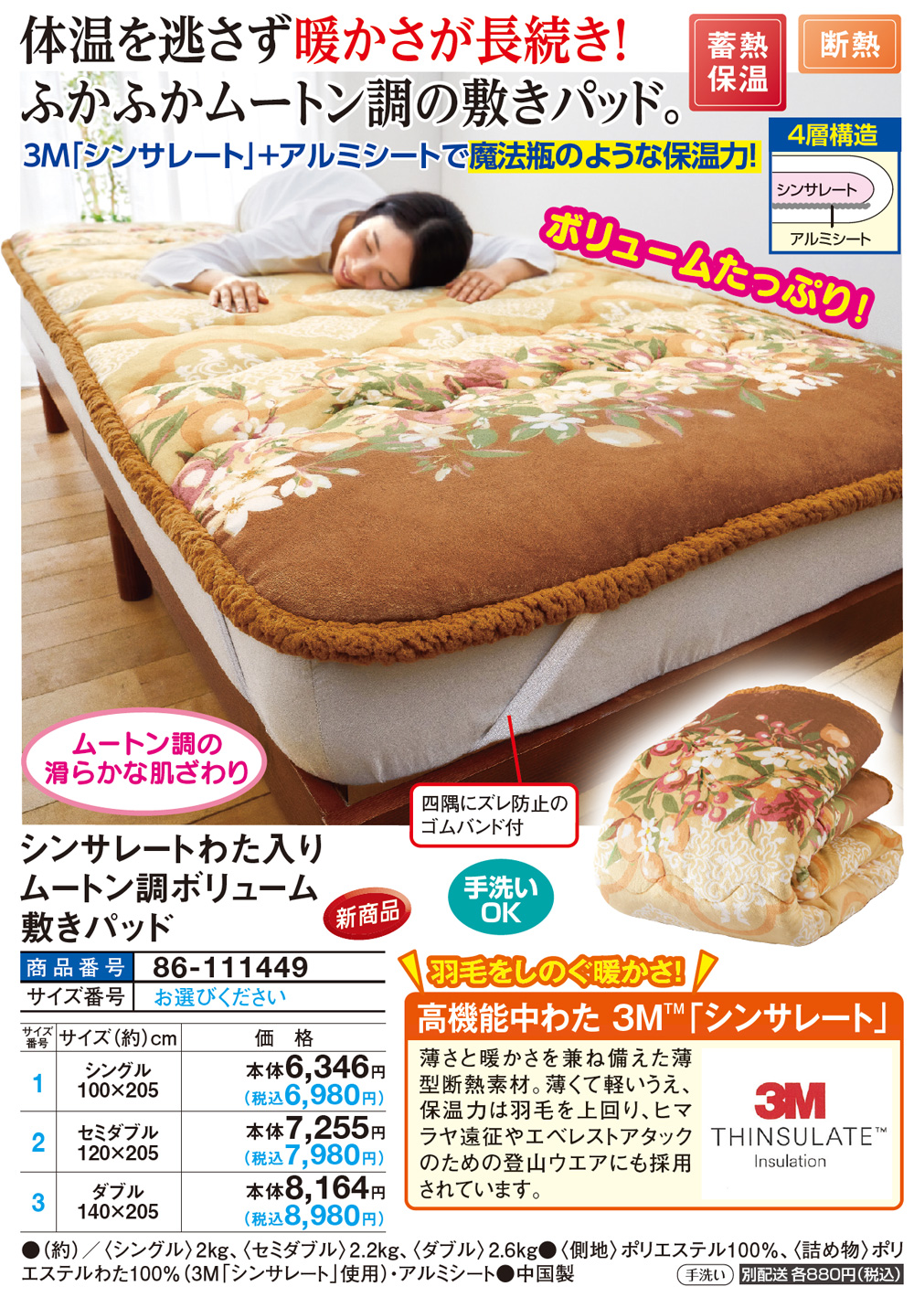 体温を逃さず暖かさが長続き!ふかふかムートン調の敷きパッド! 3M「シンサレート」+アルミシートで魔法瓶のような保温力! ボリュームたっぷり! ●ムートン調の滑らかな肌ざわり 四隅にズレ防止のゴムバンド付 \羽毛をしのぐ暖かさ!/ 【高機能中わた 3M(TM)「シンサレート」】 薄さと暖かさを兼ね備えた薄型断熱素材。 薄くて軽いうえ、保温力は羽毛を上回り、ヒマラヤ遠征やエベレストアタックのための登山ウエアにも採用されています。 ●蓄熱保温 ●断熱 ●4層構造