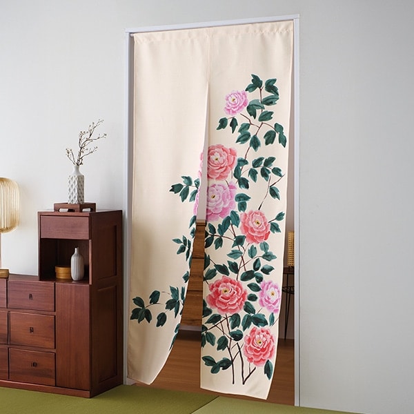 お部屋に合わせて選べるのれん! 冬牡丹 「富貴」や「幸せ」を意味する縁起の良い牡丹の花が華やかな空間を演出。 ●スリットはお好みの長さにカットできます ●間仕切りとしても使えます