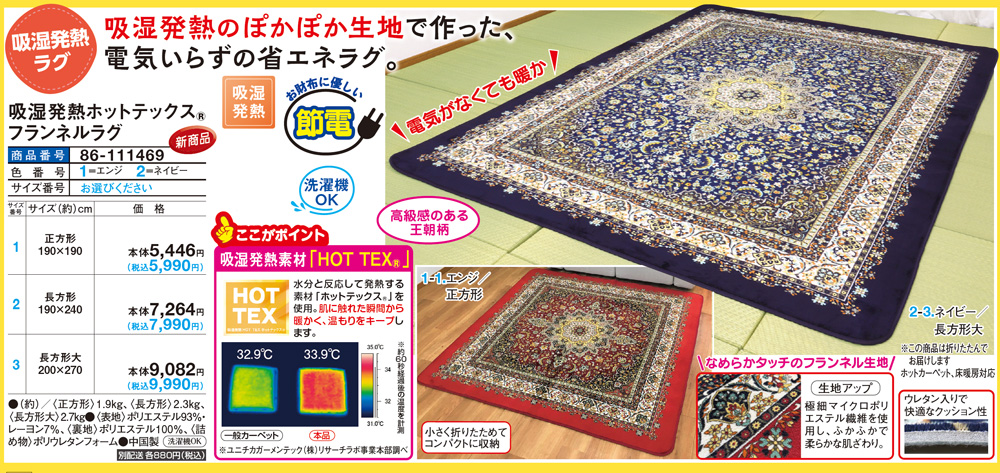 吸湿発熱のぽかぽか生地で作った、電気いらずの省エネラグ! 電気がなくても暖か! 【ここがポイント】 吸湿発熱素材「HOT TEX」 水分と反応して発熱する素材「ホットテックス」を使用。肌に触れた瞬間から暖かく、温もりをキープします。 高級感のある王朝柄 【なめらかタッチのフランネル生地】 極細マイクロポリエステル繊維を使用し、ふかふかで柔らかな肌ざわり。 ウレタン入りで快適なクッション性 小さく折りたためてコンパクトに収納 ホットカーペット、床暖房対応 ●吸湿発熱ラグ ●吸湿発熱 ●お財布に優しい節電