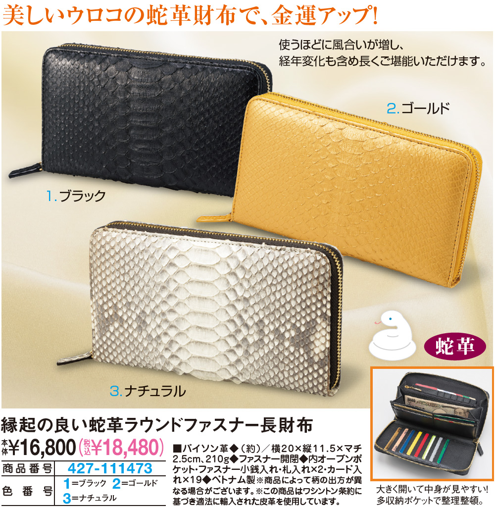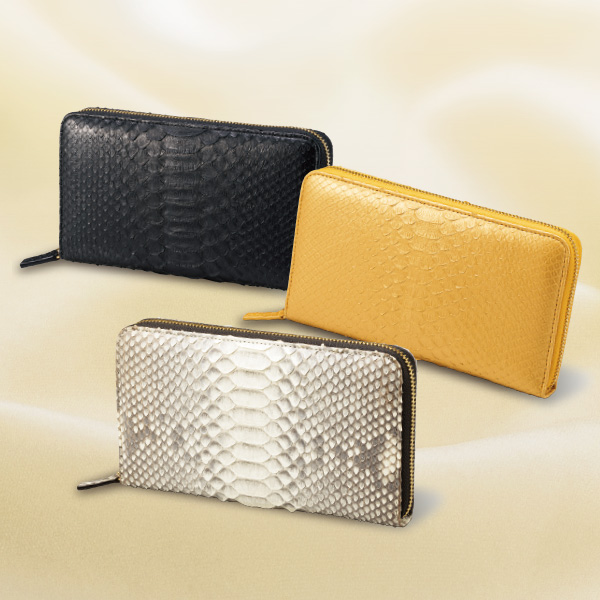 美しいウロコの蛇革財布で、金運アップ! 使うほどに風合いが増し、経年変化も含め長くご堪能いただけます。 ラウンドファスナーで大きく開いて中身が見やすい! 収納ポケットで整理整頓。