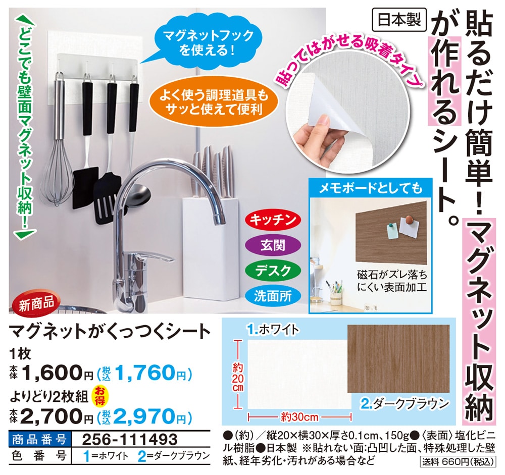 貼るだけ簡単!マグネット収納が作れるシート! ●生活雑貨 貼ってはがせる吸着タイプ \どこでも壁面マグネット収納!/ マグネットフックを使える! よく使う調理道具もサッと使えて便利 【メモボードとしても】 磁石がズレ落ちにくい表面加工 ●キッチン ●玄関 ●デスク ●洗面所
