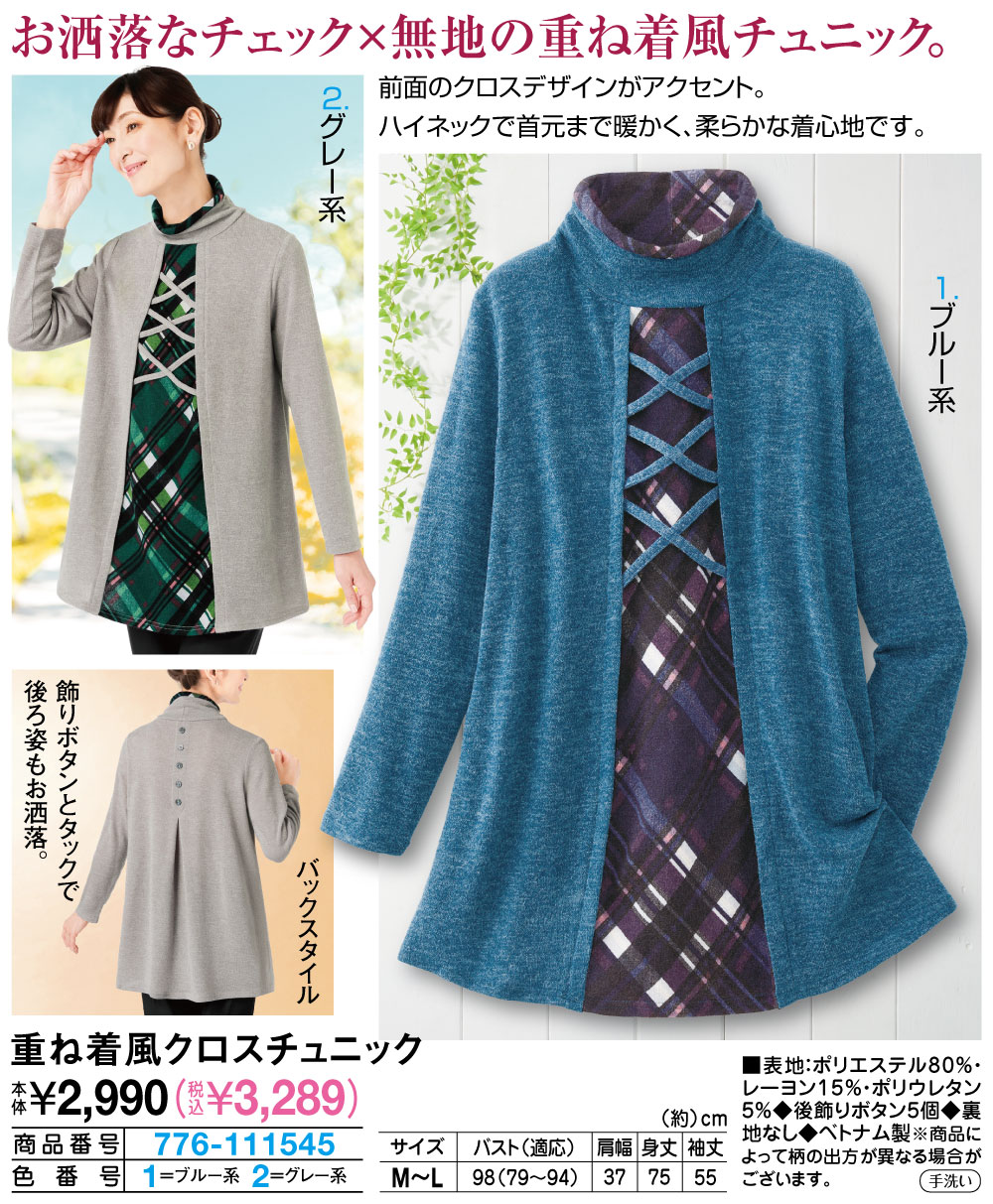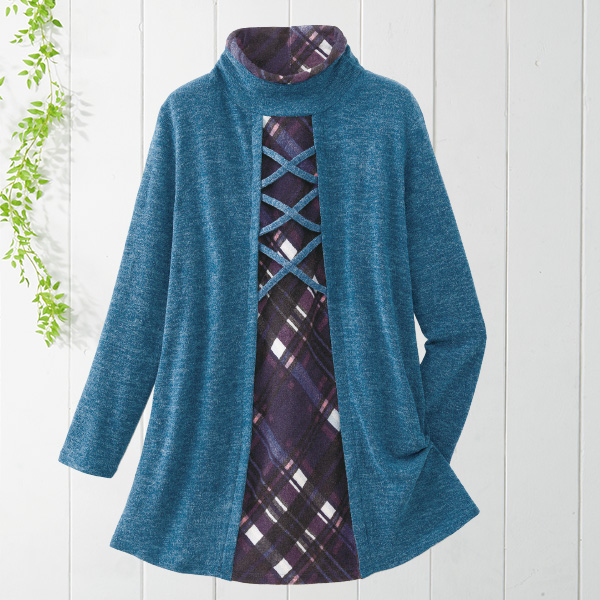 お洒落なチェック×無地の重ね着風チュニック! 前面のクロスデザインがアクセント。 ハイネックで首元まで暖かく、柔らかな着心地です。 飾りボタンとタックで後ろ姿もお洒落。