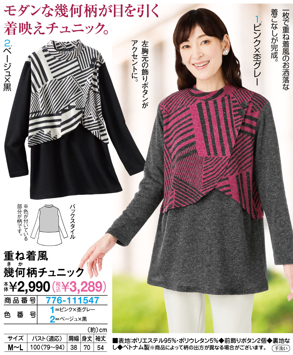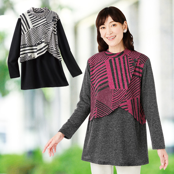 モダンな幾何柄が目を引く着映えチュニック! 一枚で重ね着風のお洒落な着こなしが完成。 左胸元の飾りボタンがアクセントに。