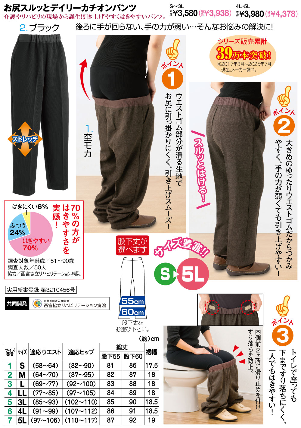 介護やリハビリの現場から誕生!引き上げやすくはきやすいパンツ! 【後ろに手が回らない、手の力が弱い…そんなお悩みの解決に!】 ●ポイント1:ウエストゴム部分が滑る生地でお尻に引っ掛かりにくく、引き上げスムーズ! ●ポイント2:大きめのゆったりウエストゴムだからつかみやすく、手の力が弱くても引き上げやすい! ●ポイント3:トイレで座っても下までずり落ちにくく、一人でもはきやすい! 【70%の方がはきやすさを実感!】 調査対象年齢歳/51~90歳 調査人数/50人 協力/西宮協立リハビリテーション病院 【シリーズ販売累計39万本突破!】 ※2017年3月~2025年7月現在。 メーカー調べ。 【共同開発】 社会医療法人 甲友会 西宮協立リハビリテーション病院 スルッとはける! 内側前2ヵ所に滑り止めを付け、ずり落ちを防止。 ◆実用新案登録:第3210456号 ●ストレッチ ●サイズ豊富!!S~5L